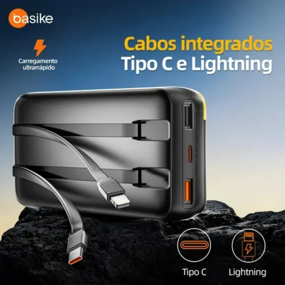 Power Bank Basike 20.000mAh 22,5W – Carregamento Rápido PD | 5 em 1 com Cabos Integrados